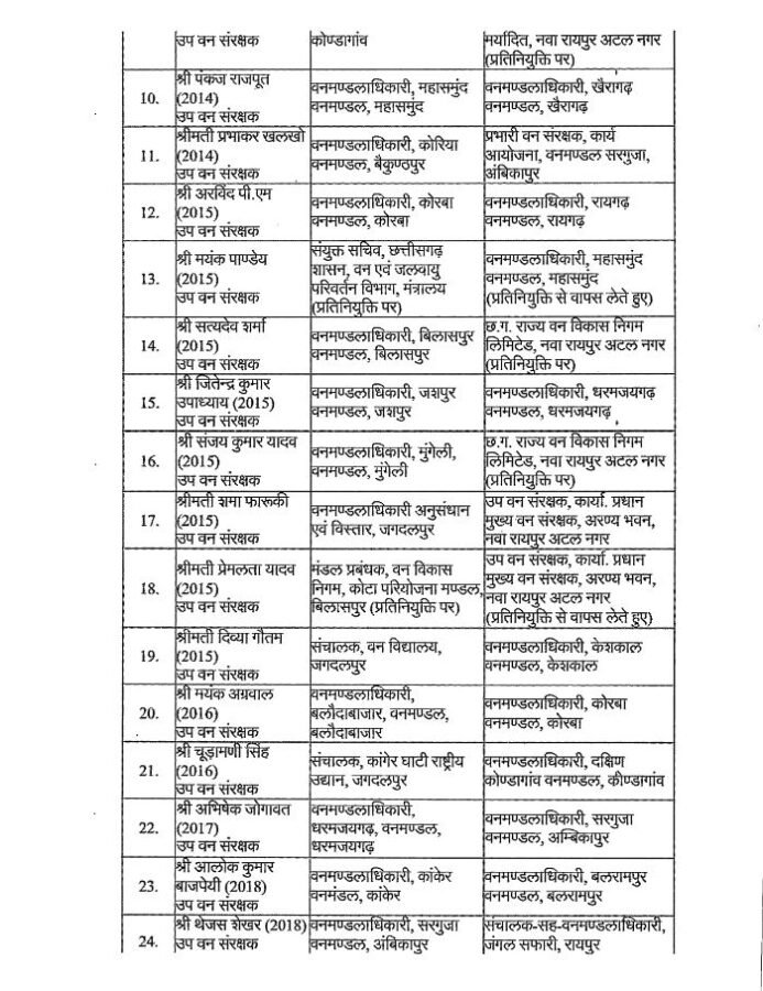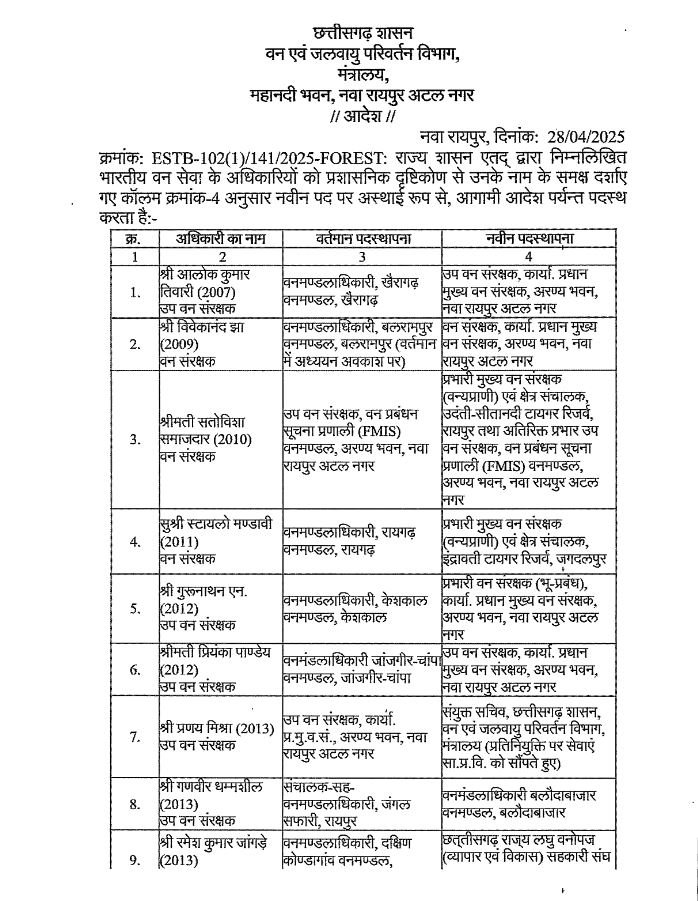रायपुर। छत्तीसगढ़ सरकार ने वन विभाग में एक बड़ा प्रशासनिक फेरबदल करते हुए 35 भारतीय वन सेवा (IFS) अधिकारियों का ट्रांसफर कर दिया है। इस बदलाव के तहत कई जिलों के डीएफओ (वन मंडलाधिकारी) भी स्थानांतरित किए गए हैं। विभाग द्वारा तबादले का आदेश जारी कर दिया गया है।