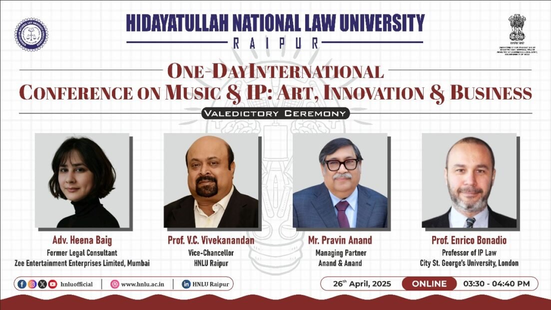 हिदायतुल्लाह राष्ट्रीय विधि विश्वविद्यालय (एचएनएलयू) रायपुर ने डीपीआईआईटी-आईपीआर चेयर और एचएनएलयू के सेंटर फॉर इनोवेशन एंड आईपी लॉज़ के सहयोग से विश्व बौद्धिक संपदा दिवस के अवसर पर एक वर्चुअल अंतर्राष्ट्रीय सम्मेलन का आयोजन किया। इस वर्ष सम्मेलन का विषय था – “म्यूज़िक एंड आईपी: आर्ट, इनोवेशन एंड बिज़नेस”, जिसमें संगीत, नवाचार और व्यवसाय की दुनिया में बौद्धिक संपदा के महत्व पर विमर्श हुआ।