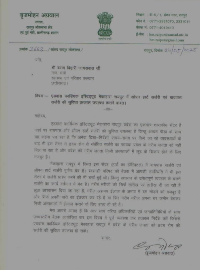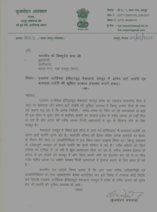 छत्तीसगढ़ की राजधानी रायपुर स्थित एडवांस कार्डियक इंस्टिट्यूट, मेकाहारा में लंबे समय से बंद पड़ी बायपास और ओपन हार्ट सर्जरी सेवाओं को लेकर अब राजनीति गरमा गई है। रायपुर सांसद बृजमोहन अग्रवाल ने इस मुद्दे को गंभीरता से उठाते हुए मुख्यमंत्री विष्णुदेव साय और स्वास्थ्य मंत्री श्याम बिहारी जायसवाल को पत्र लिखकर तत्काल कार्रवाई की मांग की है।