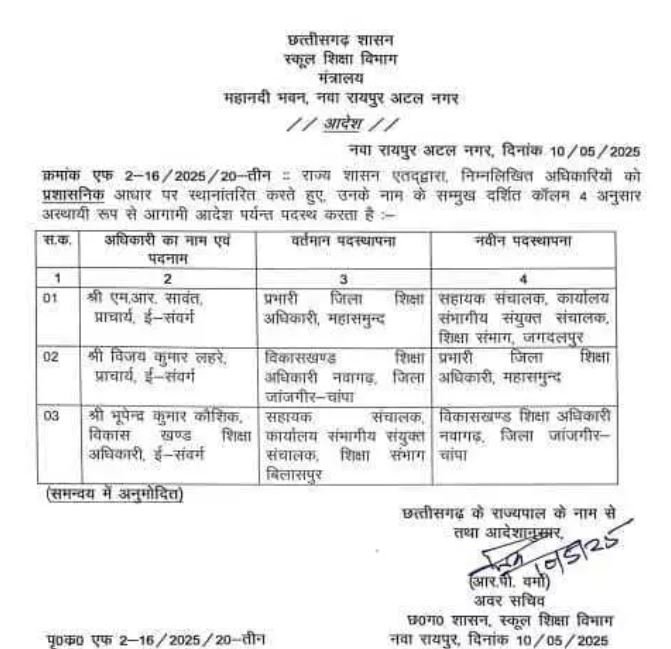 जारी आदेश के अनुसार, नवागढ़ (जांजगीर-चांपा) के खंड शिक्षा अधिकारी विजय कुमार लहरे को महासमुंद का प्रभारी जिला शिक्षा अधिकारी बनाया गया है। वहीं, भूपेंद्र कुमार कौशिक, जो वर्तमान में बिलासपुर के संयुक्त संचालक कार्यालय में पदस्थ थे, उन्हें नवागढ़ का नया बीईओ नियुक्त किया गया है।