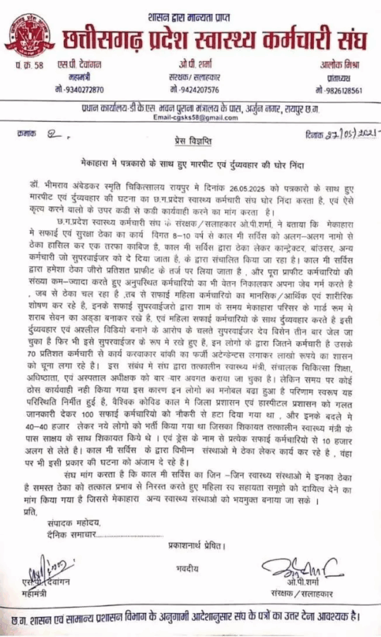 मेकाहारा अस्पताल में पत्रकारों के साथ हुई मारपीट और दुर्व्यवहार की घटना की छत्तीसगढ़ प्रदेश स्वास्थ्य कर्मचारी संघ ने तीव्र निंदा की है। संघ ने दोषियों के खिलाफ कड़ी से कड़ी कार्रवाई की मांग की है। संघ के संरक्षक एवं सलाहकार ओ.पी. शर्मा ने सफाई और सुरक्षा कार्य के लिए जिम्मेदार ठेका एजेंसी काल मी सर्विस पर गंभीर आरोप लगाए हैं।