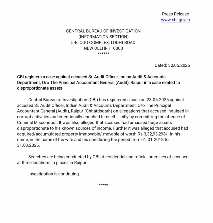 CBI द्वारा जारी आधिकारिक प्रेस विज्ञप्ति के अनुसार, यह अधिकारी 1 जनवरी 2013 से 31 मार्च 2025 तक रायपुर के महालेखाकार कार्यालय में पदस्थ रहा। इस दौरान उसने करीब 3 करोड़ 32 लाख 93 हजार 298 रुपये की अवैध संपत्ति अपने पत्नी और पुत्र के नाम पर अर्जित की। प्रेस रिलीज में कहा गया है कि इस अफसर ने अपनी सरकारी आय के अनुपात में अत्यधिक संपत्ति बनाई है, जो भ्रष्टाचार निवारण अधिनियम के तहत संदेह के घेरे में है।