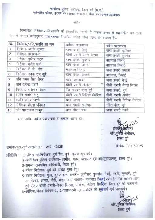 दुर्ग जिले के 13 इंस्पेक्टरों का तबादला किया गया हैं। SP विजय अग्रवाल ने विभाग के 8 निरीक्षकों, 3 उप निरीक्षकों और 2 सहायक उप निरीक्षकों की ट्रांसफर लिस्ट जारी की है। जारी सूची के मुताबिक, प्रशासनिक कारणों से 13 निरीक्षकों को तत्काल प्रभाव से स्थानांतरित किया जाता है।