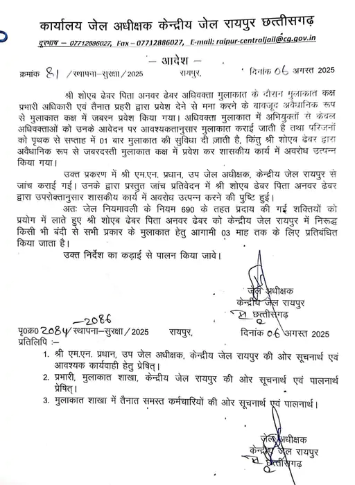 छत्तीसगढ़ शराब घोटाले के आरोपी अनवर ढेबर के बेटे शोएब ढेबर पर जेल प्रशासन ने तीन महीने की मुलाकात पाबंदी लगा दी है। बुधवार, 6 अगस्त को शोएब बिना अनुमति अधिवक्ता मुलाकात कक्ष में घुस गए थे।