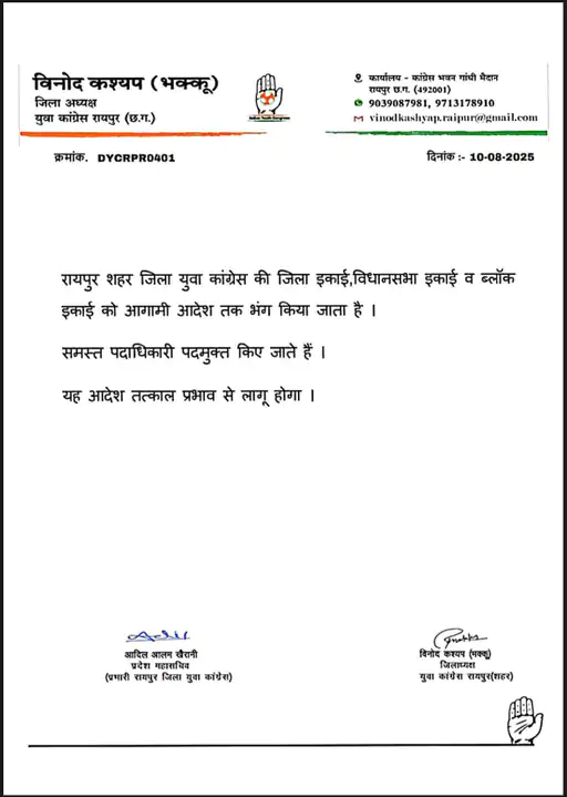 रायपुर। छत्तीसगढ़ प्रदेश युवा कांग्रेस ने रविवार को बड़ा संगठनात्मक कदम उठाते हुए रायपुर शहर जिला युवा कांग्रेस कमेटी और विधानसभा इकाइयों को तत्काल प्रभाव से भंग कर दिया। यह कार्रवाई लंबे समय से पदाधिकारियों की निष्क्रियता और संगठनात्मक कार्यक्रमों में उनकी अनुपस्थिति के चलते की गई है।