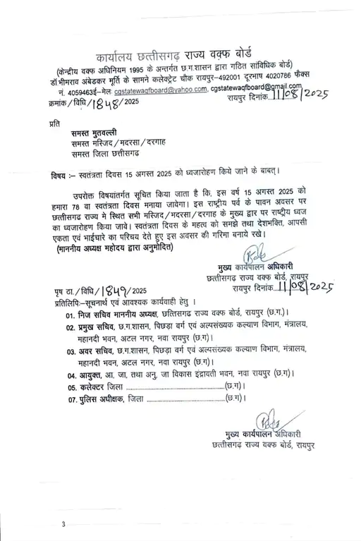 इस बार स्वतंत्रता दिवस पर छत्तीसगढ़ की सभी मस्जिदों, मदरसों और दरगाहों में तिरंगा लहराएगा। राज्य वक्फ बोर्ड के अध्यक्ष डॉ. सलीम राज ने इसके लिए प्रदेशभर के मुतवल्लियों को निर्देश जारी किए हैं। आदेश के मुताबिक 79वें स्वतंत्रता दिवस के अवसर पर सभी धार्मिक स्थलों के मुख्य द्वार पर राष्ट्रीय ध्वज फहराया जाएगा।
