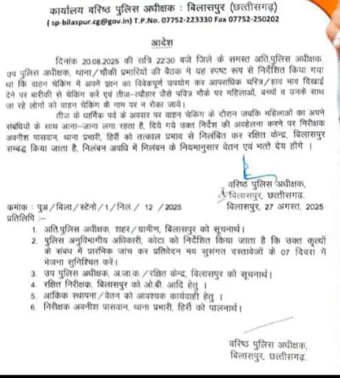 एसएसपी ने तीज और गणेशोत्सव को देखते हुए वाहन चेकिंग का दायरा बढ़ाने और महिलाओं-बुजुर्गों से शालीनता से पेश आने के निर्देश दिए थे। इसके बावजूद हिर्री क्षेत्र के भोजपुरी टोल प्लाजा पर पुलिस टीम ने तिजहारिन महिलाओं और उनके परिजनों को रोककर जुर्माना वसूला, जिससे महिलाएं परेशान होती रहीं। इस दौरान टीआई पासवान मौके पर मौजूद थे।