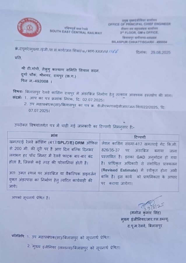 तेलुगु वेलफेयर सोसाइटी के लगातार प्रयासों से रायपुर शहरवासियों के लिए एक बड़ी सौगात मिलने जा रही है। दक्षिण पूर्व मध्य रेलवे, बिलासपुर जीएम ऑफिस से प्राप्त पत्र में यह जानकारी दी गई है कि लेवल क्रॉसिंग क्रमांक 417 पर अंडर ब्रिज का निर्माण किया जाना प्रस्तावित है। रेलवे के जीएडी से इस प्रस्ताव को अनुमोदन भी मिल गया है और जल्द ही इसका निर्माण कार्य शुरू किया जाएगा।