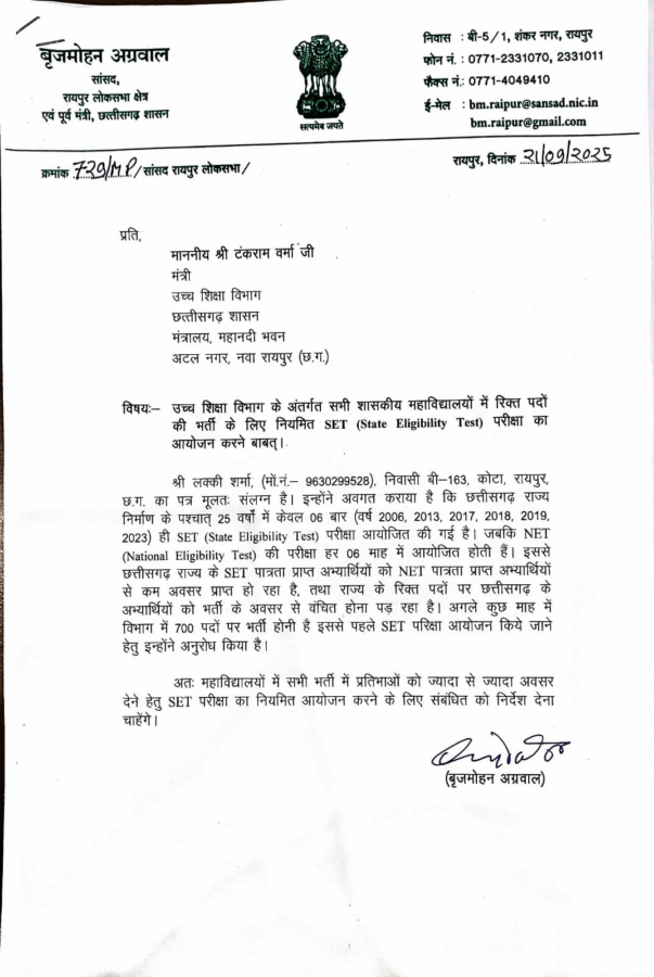 सांसद एवं वरिष्ठ भाजपा नेता बृजमोहन अग्रवाल ने राज्य में उच्च शिक्षा विभाग के अंतर्गत लगभग 700 रिक्त पदों पर भर्ती से पहले SET (State Eligibility Test) परीक्षा आयोजित करने की मांग करते हुए उच्च शिक्षा मंत्री टंक राम वर्मा को पत्र लिखा है। उन्होंने कहा कि प्रदेश के युवाओं को लंबे समय से SET परीक्षा के अनियमित आयोजन के कारण अवसरों में कमी का सामना करना पड़ रहा है।
