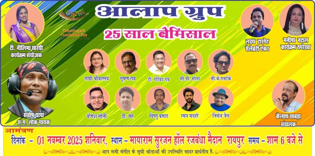 आलाप ग्रुप के द्वारा आयोजित “25 साल बेमिसाल” कार्यक्रम में मंच पर मनमोहक प्रस्तुतियां दी, जिनमे छत्तीसगढ़ लोक गायक संतोष थापा, मनीषा नटाल, टी. नीलिमा सारथी, दीपक मोटवानी, राखी श्रीवास्तव, भुषण राव, सी.पी.सोना, सी. के. रामटेके, योगेश सोनी, डी. खरे, रहे। एवं तराना ग्रुप के बैनर तले मनोज चक्रधारी , भीमसेन नन्हेट , मुकेश फतनानी , संजय वर्मा , धर्मेंद्र राठी , राजीव द्विवेदी , मंजू शर्मा , भारत माखीजा , दीपक मोटवानी , सोमित घोष और राजा घोष जैसे कलाकारों ने एक से बढ़कर एक गीत प्रस्तुत किए । हर प्रस्तुति पर तालियों की गड़गड़ाहट गूंजती रही । कार्यक्रम शाम 6 बजे प्रारंभ हुआ और देर रात तक सुरों का सिलसिला चलता रहा । श्रोताओं ने हर गीत का भरपूर आनंद लिया । रायपुर शहर के संगीत प्रेमियों से पूरा मायाराम सुरजन हाल खचाखच भरा रहा ।