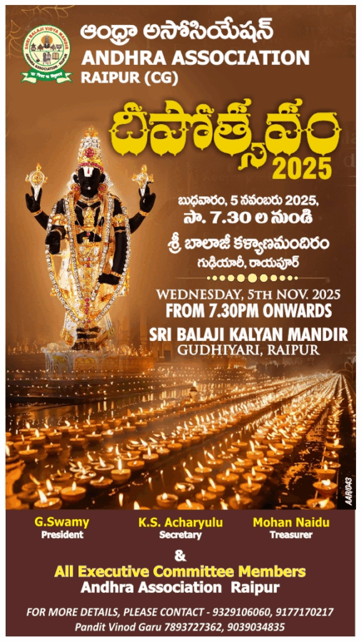 बुधवार , 5 नवंबर को शाम 730 बजे श्री बालाजी कल्याण मंदिर , गुढ़ियारी में दीपोत्सव का भव्य आयोजन किया जाएगा । अरती के बाद दीप प्रज्वलन और प्रसाद वितरण होगा । सभी श्रद्धालुओं से सपरिवार उपस्थिति का अनुरोध है ।