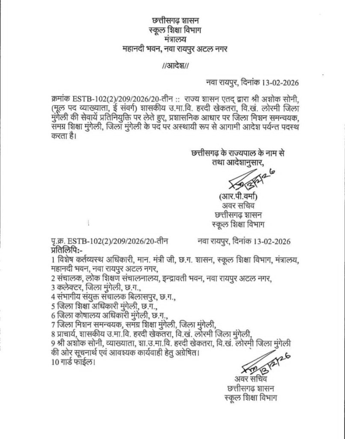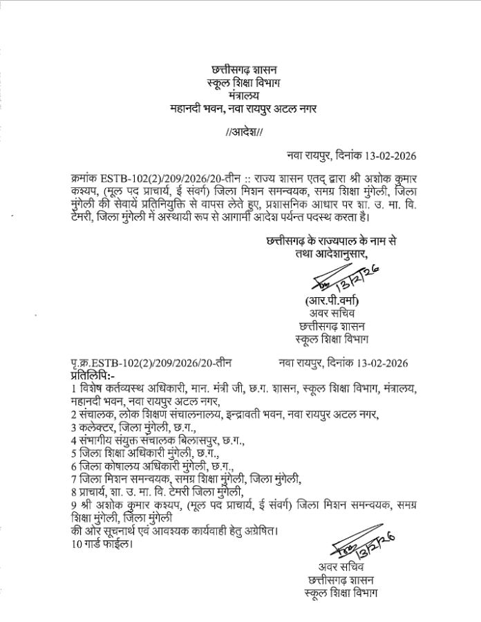 रायपुर स्थित महानदी भवन से जारी स्कूल शिक्षा विभाग के हालिया आदेश ने प्रशासनिक कार्यप्रणाली पर प्रश्नचिह्न खड़ा कर दिया है। आदेश के अनुसार अशोक कुमार कश्यप की समग्र शिक्षा मुंगेली के जिला मिशन समन्वयक (डीएमसी) पद पर प्रतिनियुक्ति समाप्त कर उन्हें शासकीय उच्चतर माध्यमिक विद्यालय टेमरी, जिला मुंगेली में अस्थायी रूप से पदस्थ किया गया है। उल्लेखनीय है कि वे वर्ष 2017 से एपीसी के रूप में कार्यरत थे और महज छह महीने पूर्व ही उन्हें डीएमसी का दायित्व सौंपा गया था। जून 2026 में उनकी सेवानिवृत्ति प्रस्तावित है, ऐसे में यह निर्णय प्रशासनिक हलकों में चर्चा का विषय बन गया है।