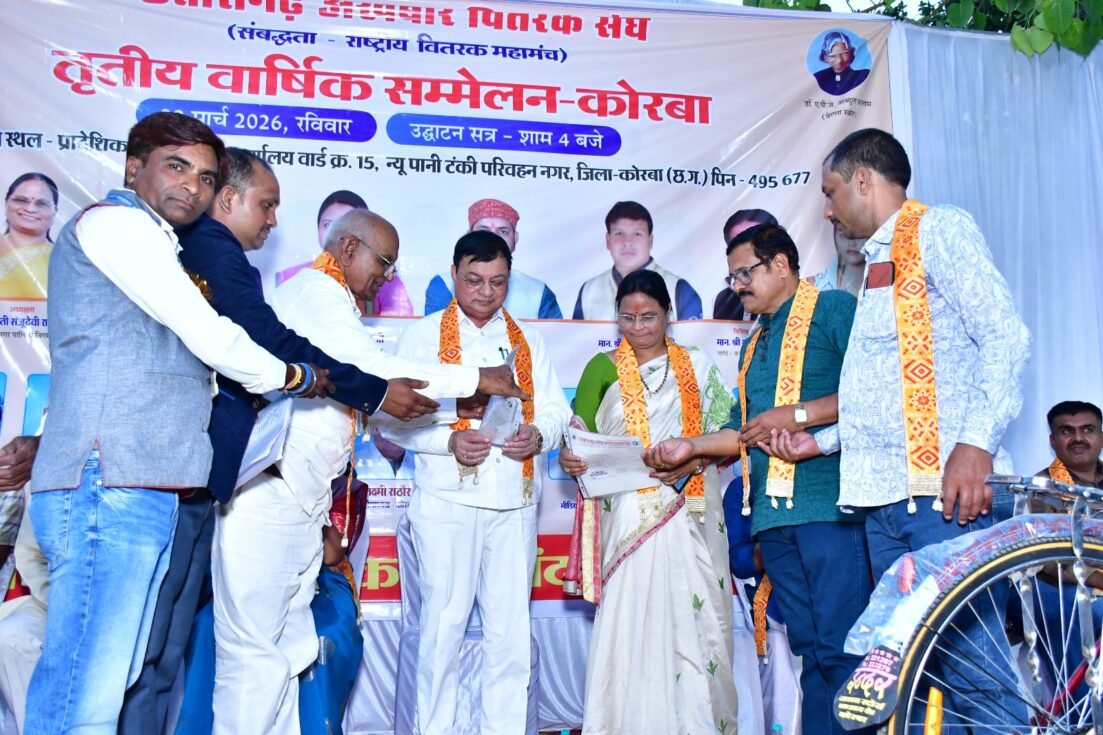 अखबार वितरक संघ का तृतीय प्रादेशिक सम्मेलन रविवार को संध्या 5 बजे भव्य रूप से आयोजित किया गया। कार्यक्रम में कोरबा विधायक एवं प्रदेश के केबिनेट मंत्री लखनलाल देवांगन मुख्य अतिथि के रूप में शामिल हुए, जबकि अध्यक्षता महापौर श्रीमती संजूदेवी राजपूत ने की। सम्मेलन में जिले सहित विभिन्न ब्लॉकों से बड़ी संख्या में वितरक सदस्य पहुंचे, वहीं राष्ट्रीय अध्यक्ष रामरक्षा सिंह और देश के विभिन्न राज्यों से आए पदाधिकारियों की उपस्थिति ने आयोजन को राष्ट्रीय स्तर का स्वरूप प्रदान किया।