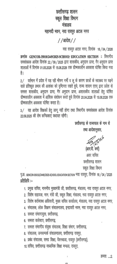 रायपुर: प्रदेश में लगातार बढ़ रही भीषण गर्मी और लू की स्थिति को देखते हुए राज्य शासन ने स्कूलों की ग्रीष्मकालीन छुट्टियों की तारीख में बदलाव कर दिया है। अब प्रदेश के सभी शासकीय, अनुदान प्राप्त, गैर अनुदान प्राप्त और अशासकीय स्कूलों में 20 अप्रैल 2026 से 15 जून 2026 तक अवकाश रहेगा। इस फैसले से लाखों विद्यार्थियों और उनके अभिभावकों को राहत मिलने की उम्मीद है, जो पिछले कुछ दिनों से तेज गर्मी को लेकर चिंतित थे।